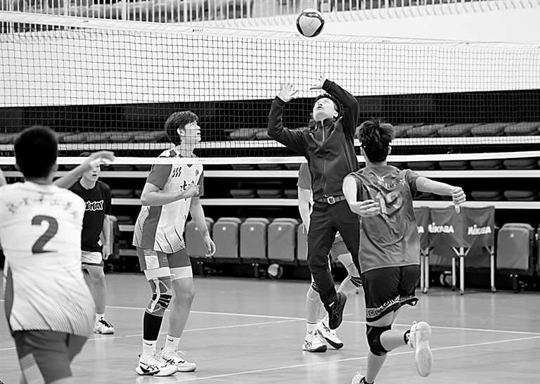 北京景山学校排球队教练与球员们一起打训练赛。新华社发