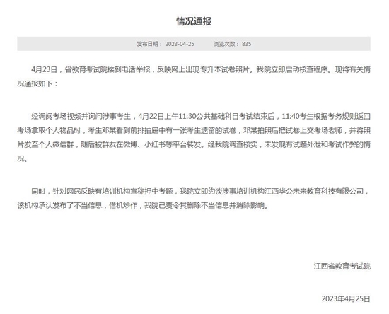 中新网4月25日电 据江西省教育考试院网站消息,4月23日,江西省教育考试院接到电话举报,反映网上出现专升本试卷照片。江西省教育考试院就有关情况通报如下:
