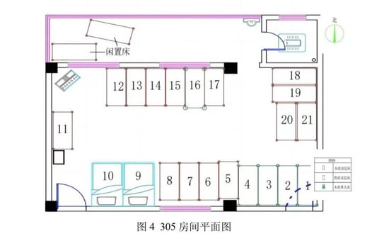 据官方所公布火灾事故调查报告中宿舍平面图,起火房间分住宿、阳台、卫生间三个部分。住宿部分,南、北各一排床铺,两排床铺中间是过道。