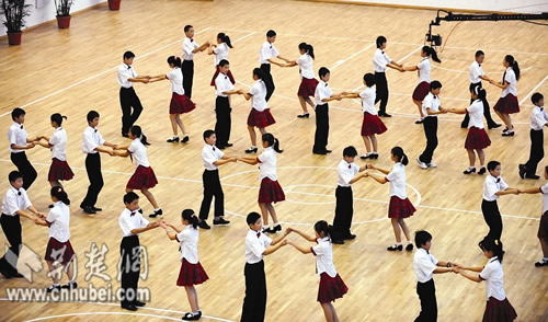 荆楚网消息 (楚天金报)记者郭会桥 通讯员邹永宁报道:女生穿着短裙,男生皮鞋锃亮,伴随着时尚动感的音乐,男女生牵起手翩然起舞……昨日,在武汉经济技术开发区一中,武汉市51所中小学的2500多名学生翩翩起舞。据悉,这是武汉市首届校园集体舞比赛,目的是希望推动校园集体舞的开展,让更多的中小学生从中受益。