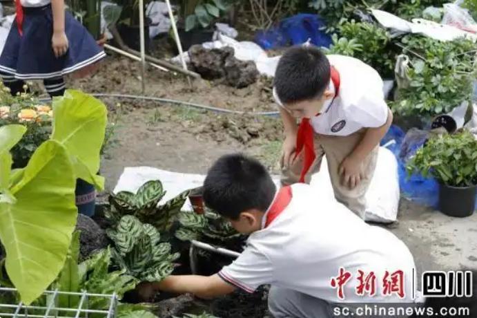 学生们亲身参与花园建设活动。成都市花木技术服务中心供图