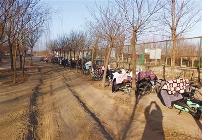 记者近日在现场看到,东西走向的崇业道在青樾园、碧樾园以西戛然而止。路牌显示两园西侧与小淀中学间有一条南北向的路叫“尚兰路”,但事实上,现场只有一片空地和一堆工程土。从新城樾风华到小淀中学大门,需沿学校院墙绕行500米,其中200米路上有渣土,状况稍好,剩下的300米为林间小路,赶上雨雪天气,几乎寸步难行。