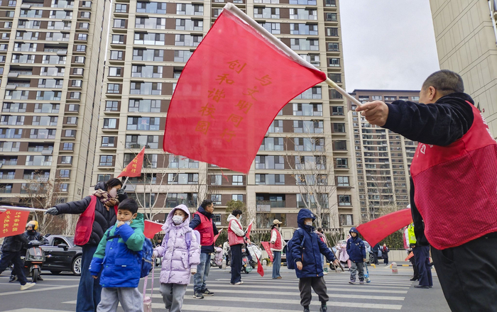 过马路的孩子多了,张雨薇也会举起手中的小红旗,示意车辆停下,让孩子们先过。“那样的护学岗还算有点用,而且我6年轮到了两次,次数不多,家长一般也没什么怨言。”张雨薇说。