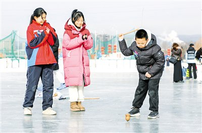 1月27日,一名青少年正在抽冰尜。当日,2025—2026呼和浩特青少年冰雪运动会在东河冰雪场启幕,吸引了来自呼和浩特市多所学校及青少年体育社会组织的400余名青少年参赛。运动会按年龄划分小学组、初中组、高中组和青少年体育社会组织组,设置冰车接力赛、射门大比拼、雪地竞速等项目,让不同年龄段的青少年都能尽情畅享冰雪运动的乐趣。本报记者 孟和朝鲁 摄