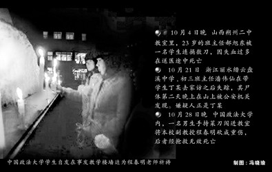 在素以尊师重教为传统的中国,有些学校的师生关系何以紧张到如此地步?师道尊严何以被践踏到如此地步?记者在采访中发现,冰冻三尺非一日之寒。虽然分别发生在山西、浙江和北京的三起弑师案,是诱发原因各不相同的极端个别事件,但在一些校园里,师生关系异化却已是不争的事实。不少专家建议,在师生关系异化的现在,重新树立教师的尊严,重建师生关系,既是教育界面临的挑战,也是全社会的责任。