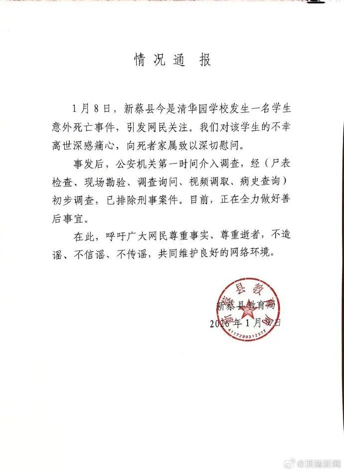 此前,1月9日,新蔡县教育局发布情况通报:1月8日,新蔡县今是清华园学校发生一名学生意外死亡事件,引发网民关注。我们对该学生的不幸离世深感痛心,向死者家属致以深切慰问。事发后,公安机关第一时间介入调查,经(尸表检查、现场勘验、调查询问、视频调取、病史查询)初步调查,已排除刑事案件。