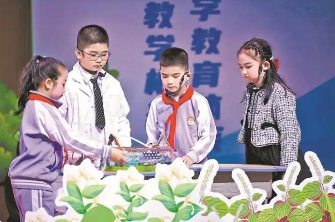 泉州师范学院附属小学的学生不仅演绎了航天人攻坚克难的《梦向太空》科教剧,还表演了《海洋——通向碳中和的蓝色之路》剧目,拟人化的碳元素揭示海洋蓝碳系统,倡导低碳生活。晋江市第四实验小学的《永怀初心》重现“两弹一星”元勋郭永怀报效祖国、用生命守护科研数据的壮烈史诗。晋江市第二实验小学带来《细胞大作战》通过细胞视角,传递健康防护与科学认知的重要性。