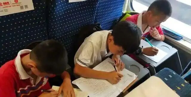 春假期间,有网友拍到,孩子们趴在高铁的小桌板上赶作业,春假变成了“换个地方写作业”。
