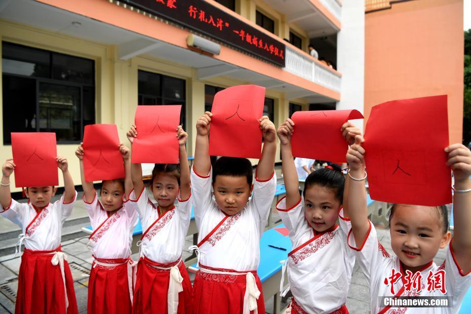 资料图:一年级新生展示自己开笔破蒙写的人字。中新社记者 张斌 摄