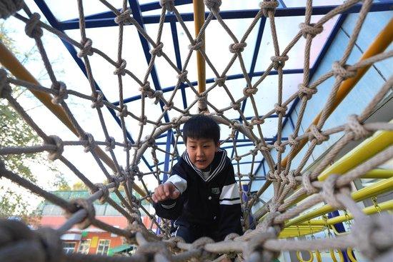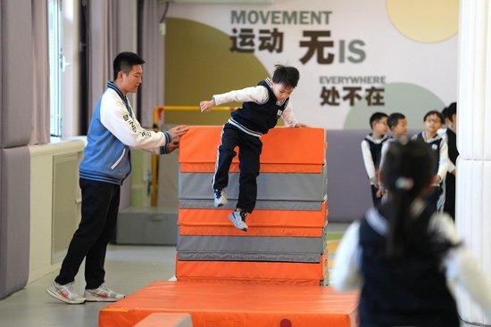 其实,学生一天的体育活动从一进校门就开始了。每天一早,校门口的攀爬架上就“挂”满了学生。“在课间、体育课程、课间操等常规体育活动以外,我们在学生的早锻炼、午间的班级活动以及课后托管时段,都无痕地融入了体育运动。”曹京说,本学期,学校进一步优化体育运动时长,在一、二年级每周增设半天体育活动专属时段——周一下午,一年级学生可以利用轮胎、跑酷器材、爬行垫等开展游戏;周四下午,二年级学生可以开展跳皮筋、踢毽子、老鹰捉小鸡等传统游戏。“我们希望能让刚刚进入小学阶段的孩子有机会玩儿得尽兴。”