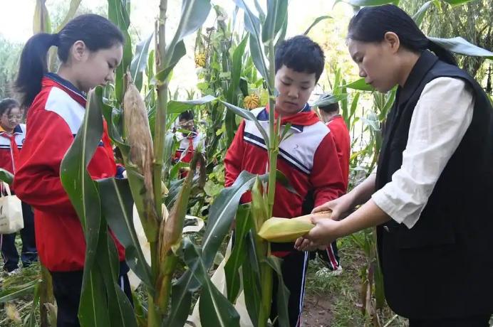 9月25日,广平县第一实验小学学生在“校园农场”收获玉米。
