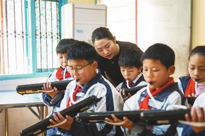 1月13日,南县三仙湖镇中心小学音乐老师(左三)指导学生练习口风琴。新华社记者陈思汗 摄