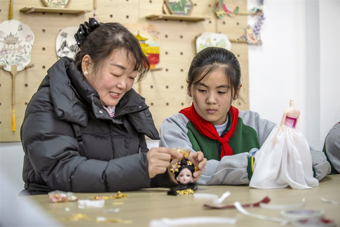 1月22日,邯郸市复兴区箭岭小学学生在制作古装娃娃。