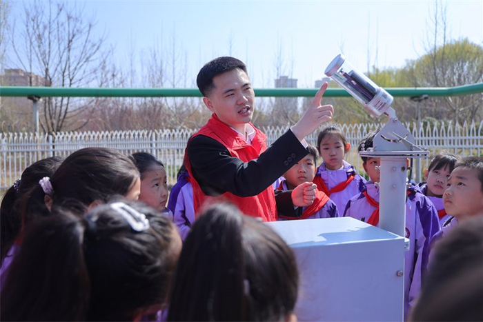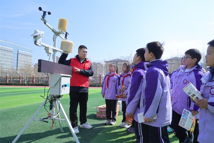 3月19日,平乡县气象局工作人员向学生介绍便携式自动气象站。