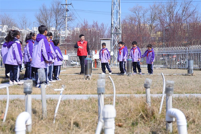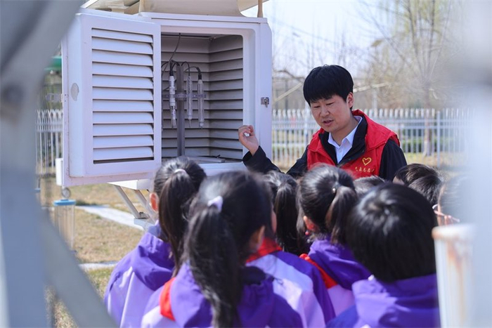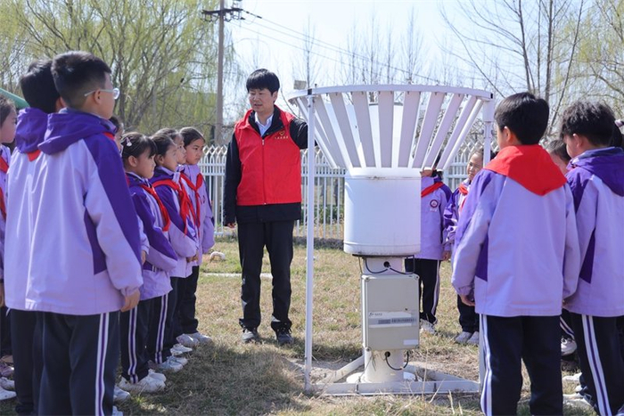 3月19日,平乡县气象局工作人员向学生介绍气象设备。