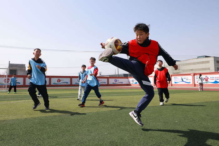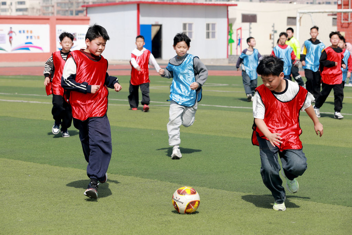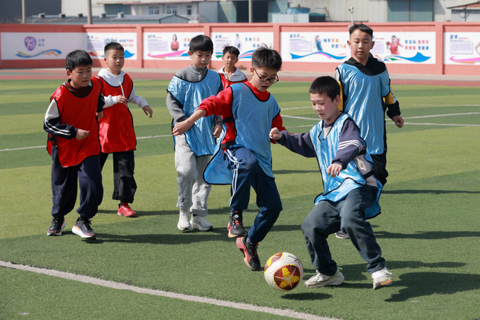 3月25日,内丘县大良村小学学生在操场进行足球比赛。