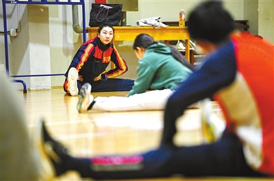 近日,袁心玥(左)带领学生热身。新华社记者赵子硕 摄