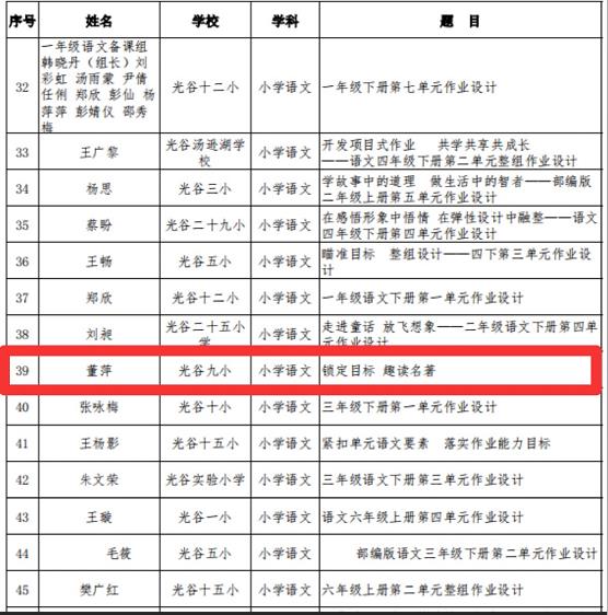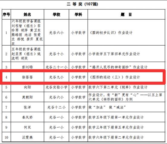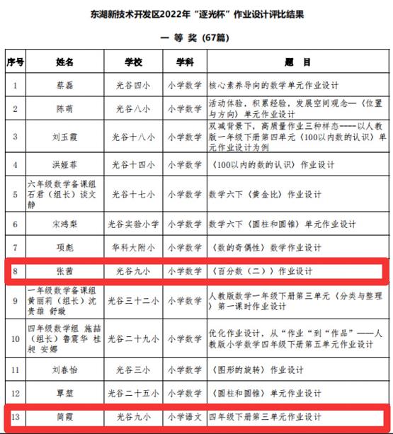 在东湖高新区2022年第一届“逐光杯”作业设计评比活动中,我校教师积极投稿,撰写近三十篇作业设计,推荐其中四篇参赛。经区专家评审的严格评选,我校教师喜获佳绩,祝贺获奖教师!