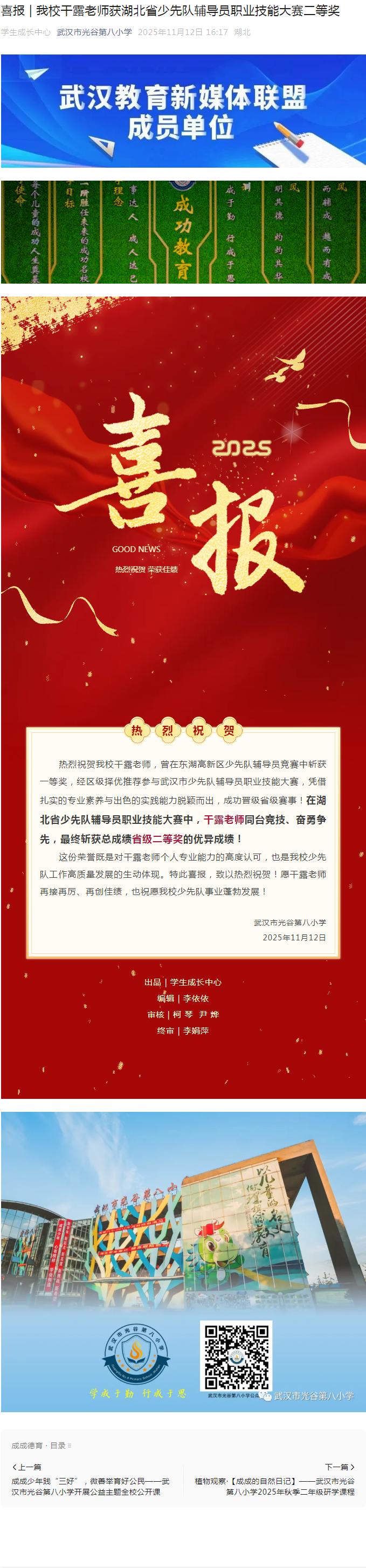 这份荣誉既是对干露老师个人专业能力的高度认可,也是我校少先队工作高质量发展的生动体现。特此喜报,致以热烈祝贺!愿干露老师再接再厉、再创佳绩,也祝愿我校少先队事业蓬勃发展!