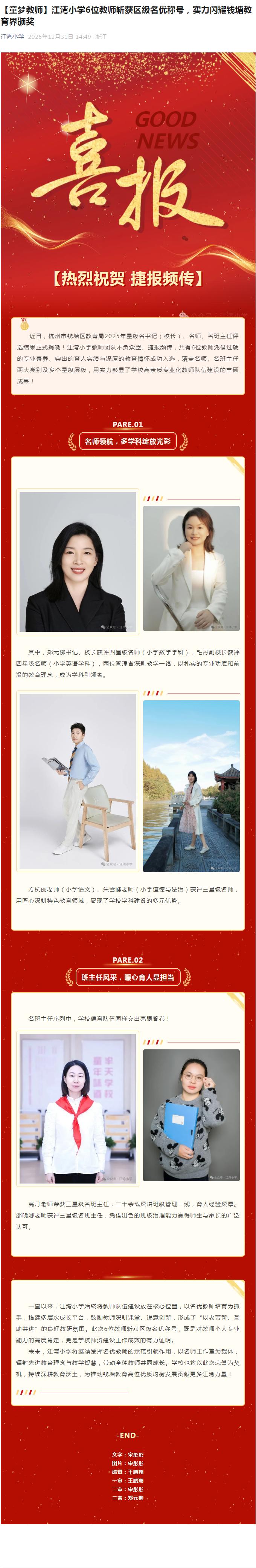 【童梦教师】江湾小学6位教师斩获区级名优称号,实力闪耀钱塘教育界颁奖