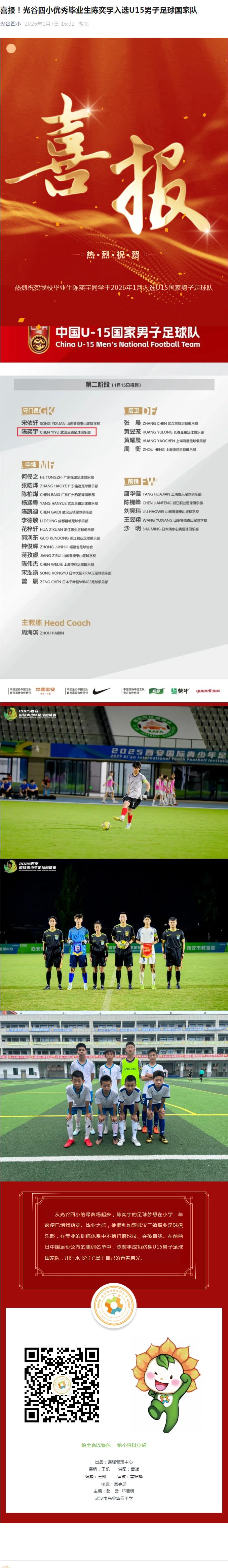 喜报!光谷四小优秀毕业生陈奕宇入选U15男子足球国家队