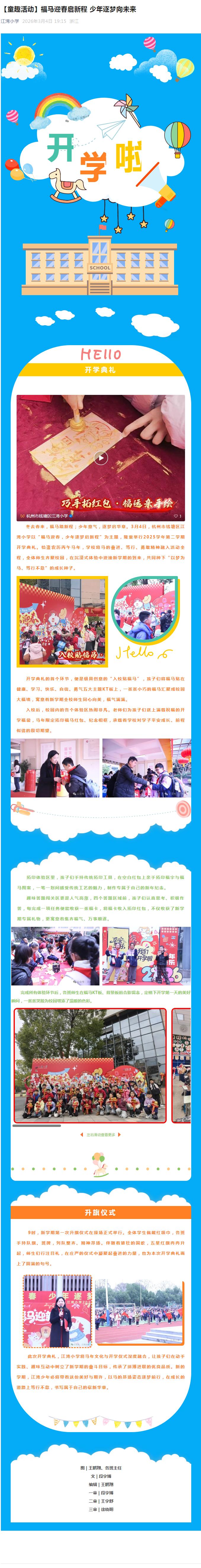 冬去春来,福马踏新程;少年意气,逐梦启华章。3月4日,杭州市钱塘区江湾小学以“福马迎春,少年逐梦启新程”为主题,隆重举行2025学年第二学期开学典礼。恰逢农历丙午马年,学校将马的奋进、笃行、勇敢精神融入活动全程,全体师生齐聚校园,在沉浸式体验中迎接新学期的到来,共同种下“以梦为马、笃行不怠”的成长种子。