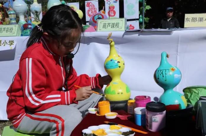 密云区学生劳动素养展示中,学生在画葫芦。图/北京教育融媒体中心