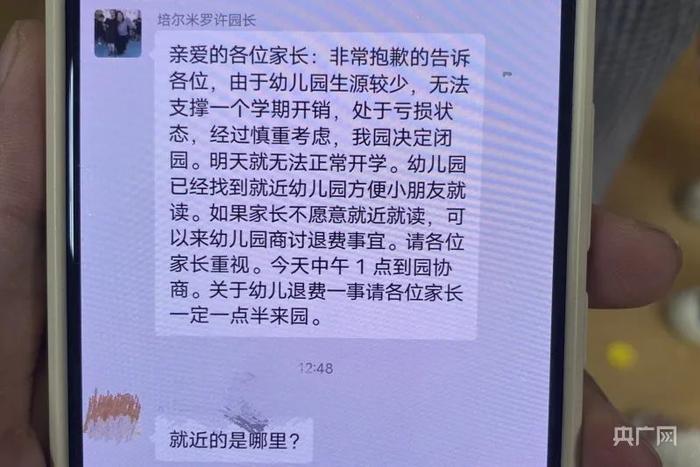 9月10日,南昌市新建区培尔米罗幼儿园在家长群发布通知,称因生源较少,无法支撑一个学期开销,处于亏损状态,决定闭园,并承诺已找到就近幼儿园方便小朋友就读,若不愿意就近就读,将逐一退还后续学费。这一消息让该园34名家长傻了眼。