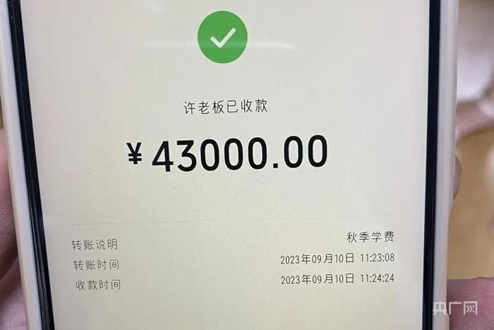 9月6日和9月10日,该园副园长万某将今年该学期的报名费3.8万元和4.3万元分别转账给了该园许园长。“我是个打工的,我只负责收费。”万某说。